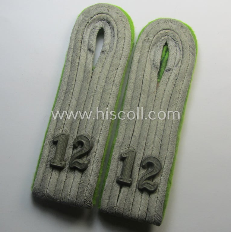 The attractive - and actually fairly scarely seen! - pair of WH (Heeres) shoulderboards on offer here are 'text-book'-examples of the typical Heeres'-type, 'Panzer-Grenadiere'-related shoulderboards and have the silverish-grey- (ie. somewhat 'sub-dued'-type) 'upperdecks': they are (I deem) just moderately used- ie. worn and show some minimal age, wear and/or staining (as can be seen on the pictures). The boards show the desirable bright-green- (ie. 'wiesen- o. hellgrüner'-) coloured branchcolour (and were constructed from the 'smooth-type' wool as to be expected). The boards came mounted onto their (typical smaller-sized) officers'-type tongues attached. The boards measure approximately 11,3 cms. in length each and were clearly worn- ie. carefully tunic-removed (as can be seen on the pictures). The pair shows two matching sets of (neatly golden-toned, larger-sized- and/or fully identical) '1'- and/or '2'-numerals (ie. 'cyphers') period-attached denoting that the pair belonged to a junior-officer ie. 'Leutnant' (ie. lieutnant) who served within the: 'Panzer-Grenadier-Regiment 12' (ie. infantry-related, rifle-regiment, numbered '12'). All four devices are minimally stained- ie. tarnished and have lost some of their gold-toned age-patina (they have somewhat 'migriert' over the years). Taking into account the fact that the set has silverish-grey- (ie. somewhat 'sub-dued'-type-) 'upperdecks' I deem that it was a pair that was used onto a typical front-used tunic. It should be mentioned that these 'Heeres'-type 'Panzer-Grenadiere'-shoulderboards are actually quite hard to come by and can easily be graded 'scarce'. Simply a very attractive shoulderboard-pair that belonged to a: 'Leutnant des Panzer-Grenadier-Regiments 12'!