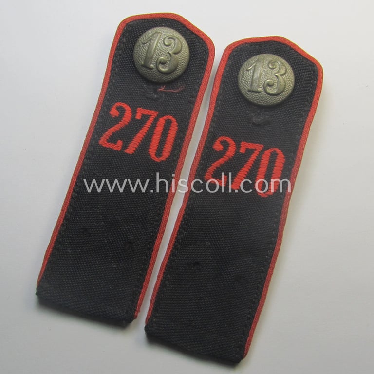 This is a truly attractive - actually very scarcely found and/or fully matching! - pair of bright-red-piped, so-called: 'Allgemeine- HJ' (ie. Hitlerjugend) shoulderstraps as was specifically intended for usage by a: 'Hitlerjunge' who served within the: 'Bann 270' (270 = 'Bann Schlossberg o. Schaulauen' in the 'Gebiet Ost Ostland') and that comes in an overall nice- (I deem used- and/or carefully tunic- ie. shirt-removed-) condition. Both straps - of which one strap still retains its period-attached 'RzM'-etiket as more often - are executed in black-coloured linnen, having the bright-red-embroidered '270'-numerals (ie. 'Ziffern') and/or bright-red-coloured- (and/or rayon-based) piping attached as to be expected. The straps come mounted onto their period tongues attached and come as found and/or issued. The straps measure 11 cms. in length each as usually encountered and show both some minimal age, wear and/or staining, I deem simply caused by decades of storage and/or minimal wear. Of additional interest is, moreover, the fact that this pair came with a set of pebbled-styled, field-grey-coloured company-buttons that show the numeral: '13' (as can be noticed on the pictures). Simply an attractive pair of 'Allgemeine HJ'-straps that belonged to a: 'Hitlerjunge' who served within the 'Bann 270' ('Bann Schlossberg o. Schaulauen') in the 'Gebiet Ost Ostland'!