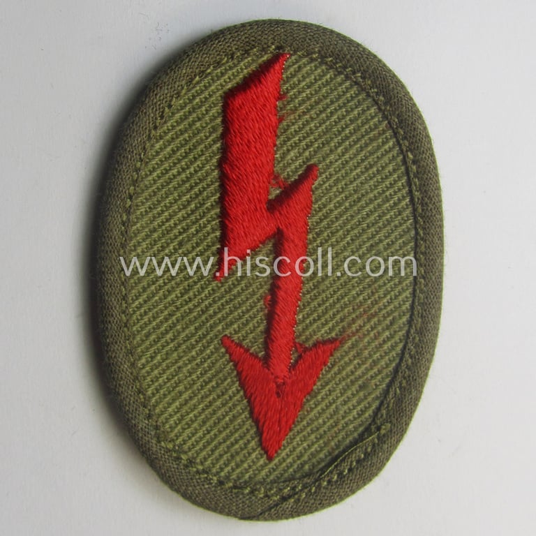 This is a neat - and simply never used! - WH (Heeres) 'tropical-styled', trade- and/or special-career insignia (or: 'Signal Blitz') as executed in machine-embroidered bright-red- (ie. 'roter'-) coloured linnen as was intended for usage by a soldier (ie. NCO) who served within the: 'Artillerie-Truppen' (or: simple soldier ie. NCO who served within one of artillery-related regiments) and that comes in an overall very nice- (ie. I deem 'virtually mint- ie. unissued'-), condition. The patch is a non-maker-marked example that shows a nicely reinforced border and dito additional backing: it does show some minimal age ie. staining simply caused by decades of storage only (as can be seen on the pictures). Simply a nice occasion to acquire a 'virtually mint', 'tropical-issue' ie. DAK- (or 'Deutsches Afrikakorps'-) related: 'Signal Blitz' as was intended for the: 'Artillerie-Truppen'!