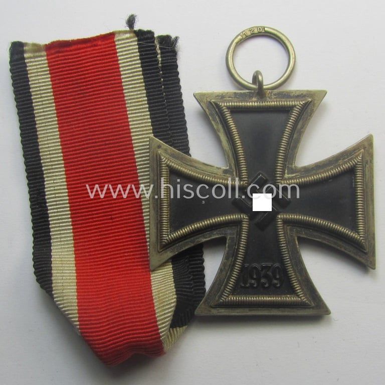 Iron Cross 2nd class (or: 'EK II. Klasse') being a maker- (ie. '120'-) marked example that comes together with its original ribbon (ie. 'Bandabschnitt') as was produced by the (not that often seen!): 'Franz Petzl'-company