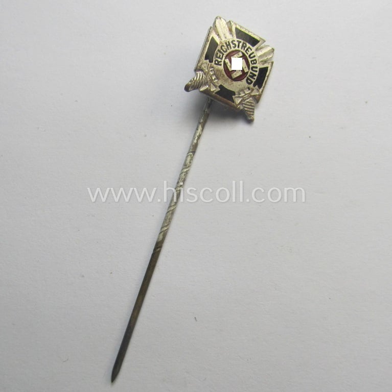 This is an attractive 14 mm.-sized miniature example of the neatly designed and semi-enamelled, commemorative membership-lapel-pin (or: 'Mitgliedsabzeichen') as intended for the: 'Reichstreubund ehemaliger Berufssoldaten (o. RTB)' being a detailed example that comes in an overall very nice- (and I deem only minimally used- ie. worn-), condition. The tiny lapel-pin shows some minor wear and/or staining but shows no damage whatsoever: it does show some minor age- and/or staining as is more often observed. On its back the pin shows a 'Ges.Gesch.'-patent-pending-marking and also shows a clear makers'-designation (that reads: 'Gante - Berlin'). The pin - which comes mounted onto its functional, long-sized pin - is also figured in the Heering-Hüsken 'Abzeichen'-catalogue wherein it is given a unique-number (9668A). Simply a neat 'Mitgliedsabzeichen' that belonged to a member who was active in one of the lesser-known TR-organisations and that is with certainty accordingly priced!