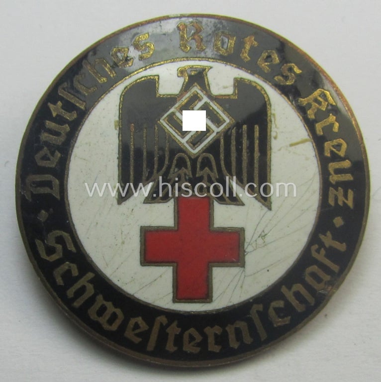 This is an attractive - and actually farily scarcely encountered! - neatly enamelled (and fully untouched!) so-called: DRK (ie. 'Deutsches Rotes Kreuz' or: German Red Cross) nurses'-badge entitled: 'Schwesternschaft' being a medium-sized version showing a neatly engraved bearers'-number: (that reads: '921'), towns'- (ie. hospital-name): 'Karlsruhe' and/or and clear makers'-designation: 'A. Stübbe - Berlin' and that comes in an overall very nice- (albeit I deem moderately used- and/or worn-), condition. The piece was clearly worn but is NOT denazified and does show some (minimal) usage-marks as can be noticed on the pictures: moreover, does it show some regular wear and shows some minor scratches ie. wear-marks (as can be seen on the pictures). The lapel-pin is nicely maker-marked: 'Ges.Gesch. - A. Stübbe - Berlin' and also is engraved with a (unique!) bearers'-number that reads: '921'. The badge most certainly belonged to a nurse (ie. trainee) that worked in a hospital or clinic based in the town of Karlsruhe (something that is obvious due to the encountered engraving). The badge comes mounted onto its fully functional and totally unaltered pin and/or pin-/catch (set-up). A similar badge is also figured in the 'Heering-Hüsken'-lapel-pin-catalogue, where it is given the unique reference-number: 5613XH. The badge on offer here was never cleaned and shows an attractive (silver-toned) patina on its back. This is the medium-sized version (having an approximate diameter of 3,2 cms.). Simply a very attractive and honest example of this desirable DRK 'Schwesternschaft' lapel-pin that is not that often offered for sale and that is I deem priced accordingly!