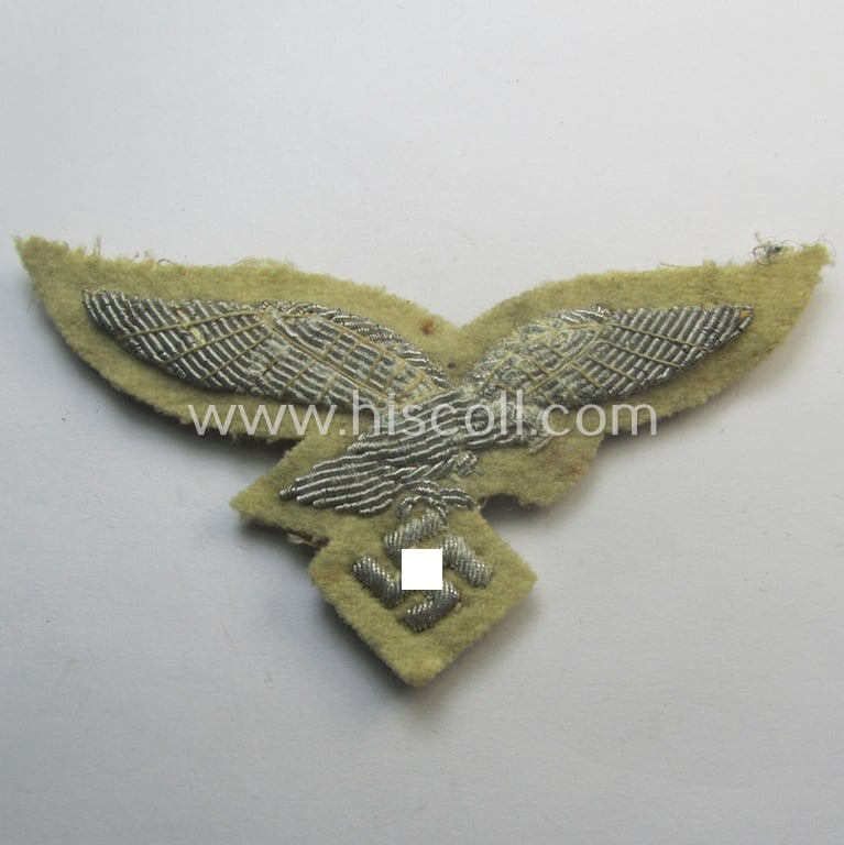 This is an attractive - and actually quite scarcely encountered! - example of a WH (Luftwaffe) neatly hand-embroidered, officers'-type visor-cap eagle (ie. 'Schirmmützenadler für Sommer-Schirmmützen der Offizieren der Luftwaffe') that is executed on beige-white-coloured wool as was specifically intended for usage onto the various white-topped, LW officer-type visor-caps and that comes in an overall nice- (I deem just moderately used- and/or once cap-attached-), condition. The eagle comes in a nice condition overall: it only shows some minor age (and minimal corrosion-marks) simply caused by moderate wear and/or decades of storage. The piece - which has an approximate wingspan of approximately 7 cms. is (as more often) - still shows its metal-based 'backing-plate' that retains its three prongs in place (as can be seen on the pictures). The eagle has great detail (extraordinary embroidery!) and can of course excellently be used to restore any white-topped, LW-officers'-pattern visor-cap. Simply a truly rarely encountered piece of LW cloth-insignia that is with certainty accordingly priced!