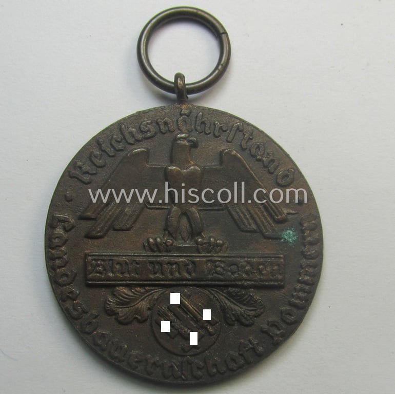 Darkened golden-bronze-toned, typical 'Reichsnährstand'- (ie. 'RNSt.'-) related, (portable) loyal-service award entitled: 'Reichsnährstand - Landesbauernschaft Pommern - Für treue Dienste'