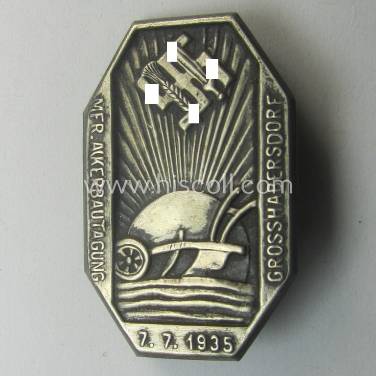 Unusually found, silver-toned 'Reichsnährstand'- (ie. 'RNSt.'-) related day-badge (ie. 'tinnie') as was issued to commemorate an: 'RNSt.'-gathering ie. show entitled: 'Mfr. Ackerbautagung - Grosshabersdorf - 7.7.1935'