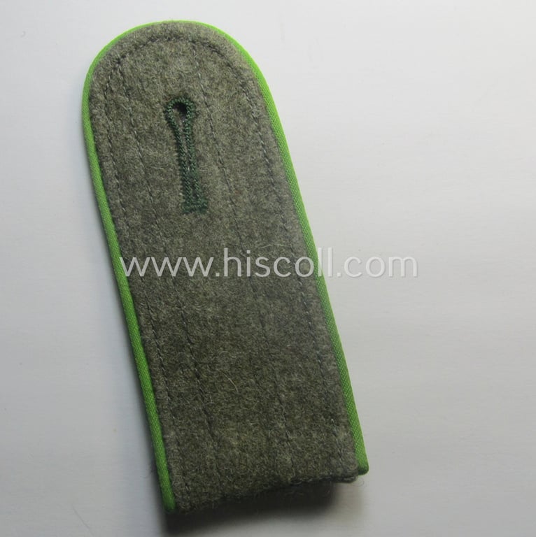 The attractive - and with certainty not that easily found! - WH (Heeres) later-war period- (ie. 'simplified'- ie. 'M44-'-pattern-) enlisted-mens'-type shoulderstrap shows the desirable bright-green- (ie. 'wiesengrüner'-) coloured branchcolour and was intended for a: 'Soldat der Panzer-Grenadier-Truppen' (ie. simple soldier who served within an infantry-related, so-called: rifle-regiment ie. unit). The neat strap shows the typical 'silk-like'-type piping attached and measures approximately 10,5 cms. in length and is clearly of the simplifie, so-called: 'last-ditch'- (ie. 'M44'-) pattern. The shoulderstrap is constructed from the (typical) field-grey-toned, later-war-type wool and comes naturally mounted onto its functional tongue (as can be noticed on the pictures). The strap just shows some minimal age ie. staining and was (I deem) simply never worn nor used. It should be noted that these bright-green-piped- (thus 'Panzer-Grenadiere'-related) and/or later-war period- (ie. 'simplified'- ie. 'M44'-pattern) enlisted-mens'-type shoulderstraps are quite desirable and can easily be graded 'scarce' even more so when they come in such a very nicely preserved condition as the strap on offer here: too bad that it is only a single specimen!