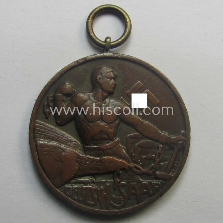 This is a nicely preserved - and with certainty not that easily encountered! - reddish-bronze-toned and medium-sized, so-called: N.S.D.A.P.-related, commemorative medal (ie. 'Erinnerungs- o. tragbare Medaille') showing a swastika and man 'loosening the chains' and that is entitled: 'Deutsch die Saar' and that shows on its back the superimposed text (and oakleaves): 'Frei die Saar - 18. Januar 1935' and that comes in a moderately worn- (albeit fully undamaged and/or nicely preserved-), condition. The medal - that is totally void of a makers'-designation - retains a fully untouched, reddish-bronze-toned (and somewhat shiny!) surface (as can be seen on the pictures). These attractive 'Erinnerungs- o. tragbare Medaillen' were awarded (in similar form and/or model) from 1935 onwards and are actually not that commonly encountered. This attractive - and totally undamaged! - example has an approximate diameter of 3,8 cms. and originates from a German private-household: it came without a ribbon and was never before part of a collection. I deem that I priced this attractive and/or nicely preserved and 'high-quality-produced' example of a: 'Erinnerungs- o. tragbare Medaille' commemorating the annexation of the Saar in the year 1935, accordingly!
