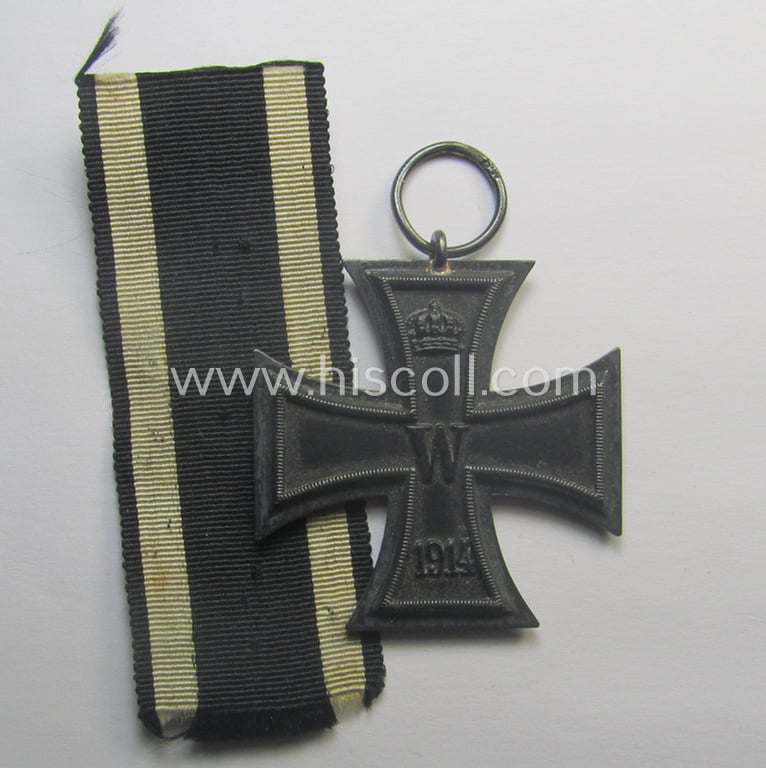 This is an attractive example of an (I deem) surely issued- and just moderately worn example of a WWI-period: 'Eisernes Kreuz II. Klasse' (or: iron cross second class) and that comes as issued and/or recently found. The detail on this example is nicely preserved: it has - I deem - never been cleaned nor polished and has an attractive and/or minimally tarnished age-patina (as can be seen on the pictures). The cross came together with its folded (truly shortened and/or confectioned) ribbon (ie. 'Bandabschnitt'). The IC truly retains nice details and shows an impressed makers'-designation in its ring (that reads I deem S.W.) as can be seen on the pictures. The cross has a very nicely preserved, black-finished (ie. somewhat 'satin-like'- ie. 'shiny-style'-) core and is void of any damage or paint-loss and has been truly nicely preserved. The piece is just a tiny bit dusty and/or stained but was never cleaned nor polished (as can be seen on the pictures). The ribbon (approx. 8 cms. sized) shows only minimal usage and/or staining. Simply a neat WWI-period- and neatly maker-marked 'EKII. Klasse' that is with certainty accordingly priced!