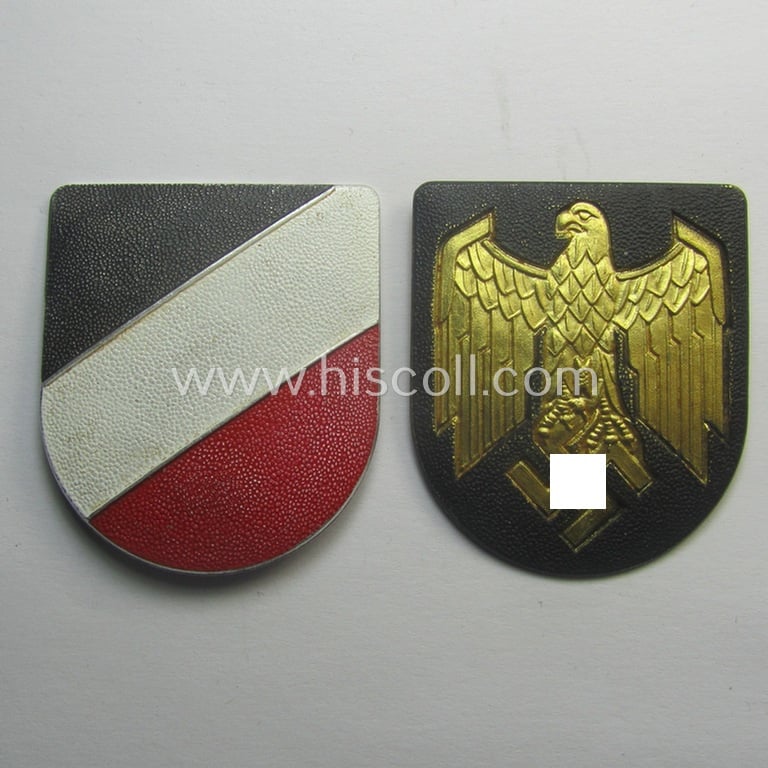 This is an attractive - truly hard to encounter and I deem simply never used and/or fully matching! - WH (Kriegsmarine) tropical- (ie. 'DAK'- or: 'Deutsches Afrikakorps'-) related- and/or typical aluminium-based, eagle- and national-colours-'pith-helmet'-shield-set (ie. 'Schildersatz für Tropenhelm der Kriegsmarine') comprising of two non-maker-marked examples that come both in an overall nice- (ie. simply never pith-helmet-attached- and/or still 'virtually mint- ie. unissued'-), condition. Both shields miss, however, some of their (also aluminium-based and truly very fragile!) pins: only a few are still in place. The shields both retain almost all of their painted- (ie. sprayed) surface and are void of any damage or alike (as can be seen on the pictures). Simply a nice occasion to acquire a fully matching, naval-related 'pith-helmet'-shield-set for a competitive price!