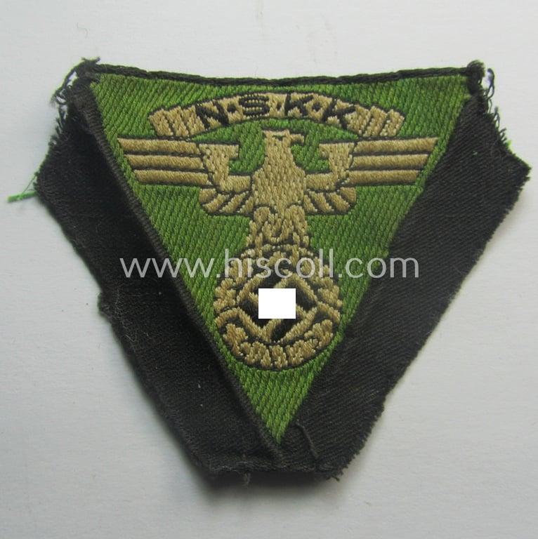 This is an attractive - and truly used- ie. carefully cap-removed - example of a so-called: N.S.K.K. (ie. 'National Socialistisches Kraftfahr Korps') side-cap-eagle (ie. 'Adler für Schiffchenmütze') as was specifically intended to be worn onto the black-coloured, so-called: 'N.S.K.K.-Schiffchen o. Lagermütze') being a (typical) 'BeVo'-woven-example that comes woven onto a bright-green- (ie. 'hellgrüner'-) coloured background and that comes in an overall nice- (ie. just moderately used- ie. worn-), condition. The cap-eagle - which is neatly woven in the so-called: 'BeVo'-type-weave-technique - has the bright-green- (ie. 'hellgrüner'-) coloured branchcolour and was as such thus intended for the N.S.K.K.-troops that belonged to the: 'N.S.K.K. Motorgruppe Thüringen o. Ostsee' (as can be seen on the pictures). The trapezoid-shaped piece was carefully pre-folded- and confectioned. Simply an attractive example of an 'N.S.K.K.-Adler für Schiffchenmütze' that will be hard to be upgraded!