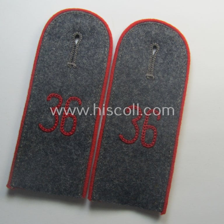This is an attractive - and/or fully matching! - pair of WH (Luftwaffe) neatly 'cyphered', enlisted-mens'-type shoulderstraps as was piped in the bright-red- (ie. 'roter'-) coloured branchcolour as was intended for usage by a soldier who served within the: 'Flak-Artillerie Abteilungs 36' (or: anti-aircraft unit, numbered: '36') and that comes in an overall very nice- (albeit moderately used and/or worn- and/or carefully tunic-removed-), condition. The shoulderstraps - which measure approx. 11,3 cms. in length each - have the neat, bright-red-coloured branchcolour (and/or: 'woolen-like'-type piping) and come without tongues as found (they are clearly a pair of the 'sew-in'-pattern and were in my opinion carefully 'cut-off'-a tunic as can be seen on the pictures). Both straps show neat machine-embroidered: '3'- and/or '6'-numerals (ie. 'Ziffern') which are executed in bright-red-coloured linnen ie. wool (done by means of so-called: 'Kürbelstickerei' as can be noticed on the pictures). The pair shows almost no wear whatsoever: just some minimal age ie. wear is visible and/or present. Simply a great and/or fully 'matching', neatly 'cyphered' LW-Flakartillerie shoulderstrap-pair that can easily be used to complete a LW 'Viertaschenrock'!