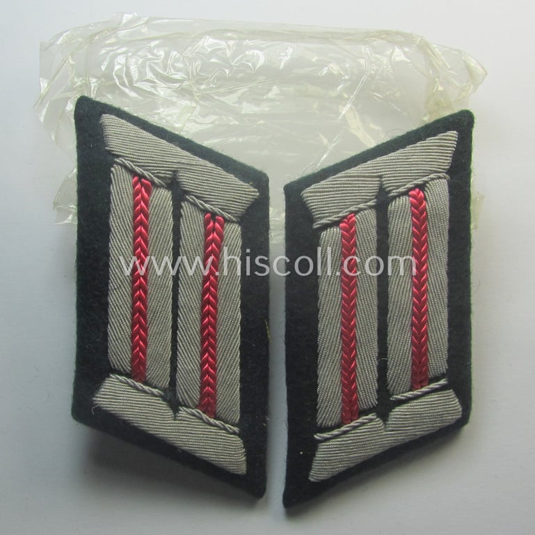 This is a very attractive - fully matching and actually quite hard to find! - pair of (I deem early- ie. mid-war-period!) 'standard-issue'-pattern and neatly hand-embroidered, officers'-type collar-tabs (ie. 'Kragenspiegel für Offiziere') as piped in the bright-pink- (ie. 'rosaroter'-) coloured branchcolour as was intended for usage by an: 'Offizier der Panzer- o. Panzerjäger-Truppen' (or: officer who served within a tank- ie. tank-destroyer-unit or regiment) and that comes in an overall very nice- (ie. simply never used - ie. still 'virtually mint ie. unissued'-), condition. The bright-pink piped pair - which is neatly 'backed' with beige-coloured, buckram-based material as is more often observed - is neatly hand-embroidered in silverish-grey-toned braid and comes still 'packed' in its its period 'Cellophan'-pouch as issued (as can be seen on the pictures). The pair does show some minimal age and/or staining (as can be seen on the pictures). Simply a very attractive - and truly not that easily found! - WH (Heeres) officers'-pattern collar-tab-pair that was intended for an: 'Offizier der Panzer- o. Panzerjäger-Truppen' and that will be very hard to be upgraded!