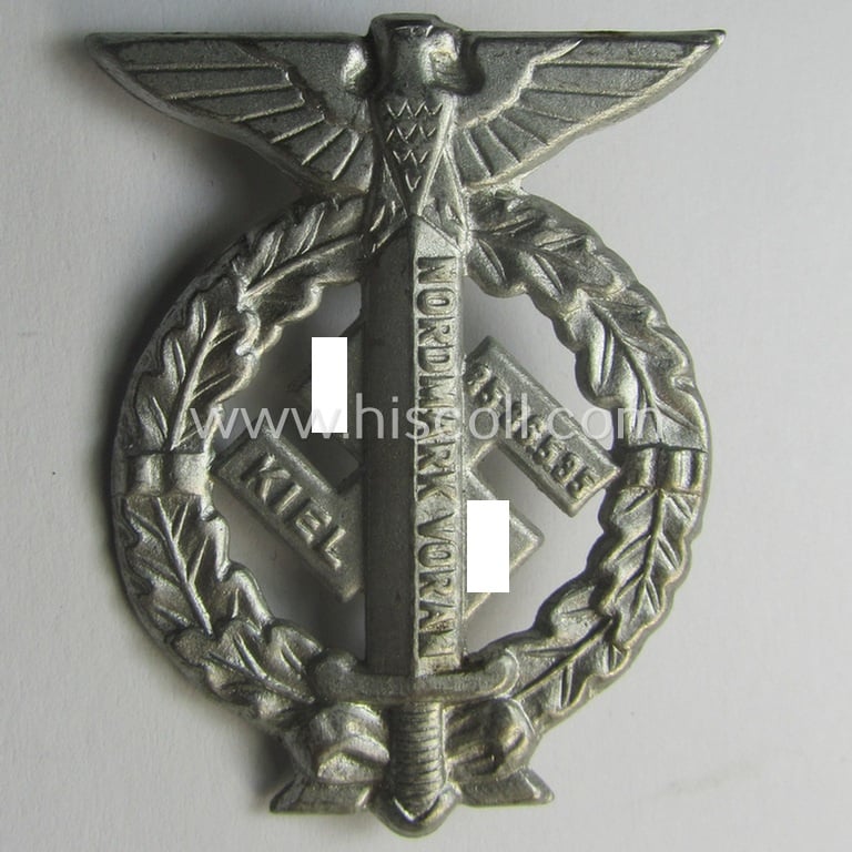 The neat - and hardly used! - N.S.D.A.P.- (ie. SA-) related day-badge (ie. 'tinnie' or: 'Veranstaltungsabzeichen') is executed in (bright!) silver-coloured- and (I deem) tin-based metal and depicts an eagle-device, upward-positioned sword, swastika and text that simply reads: 'Nordmark Voran - Kiel - 25.26.5.1935' and that was as such intended for an N.S.D.A.P.- (ie. possibly SA-) related gathering held on both days in the year 1935. The neat day-badge has an approximate height of 4,6 cms. and just shows some normal wear and/or age: it comes naturally mounted onto its functional pin-/catch set-up and has (I deem) never been cleaned nor polished: it shows some truly minimal staining (as can be seen on the pictures) but is still very detailed and/or pronounced. Simply a nice occasion to acquire an attractive N.S.D.A.P.- (ie. SA?) related so-called: 'Tagungs- o. Veranstaltungsabzeichen' for an interesting price!