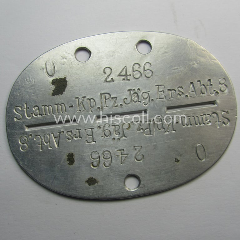 Aluminium-based, WH (Heeres) 'Panzer- o. Panzerjäger'-related ID-disc bearing the clearly stamped unit-designation that reads: 'Stamm-Kp./Pz.Jg.Ers.Abtl. 8' and that comes as issued and/or worn