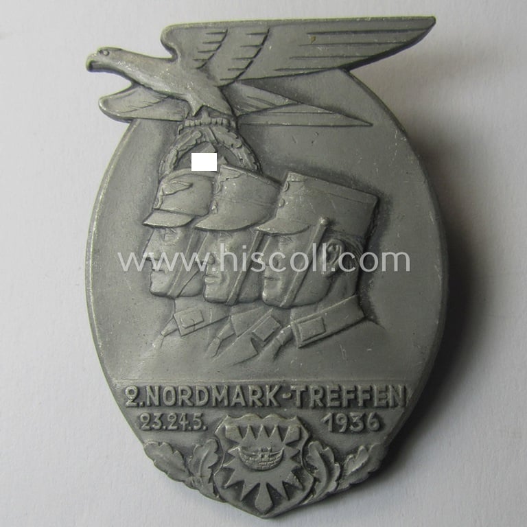 Commemorative, SA- (ie. 'Sturmabteilungen'-) related 'tinnie' depicting an illustration of 3 'SA-Mitglieder' and typical 'Reichsadler'-device coupled with the text: '2. Nordmark-Treffen - 23.24.5.1936'