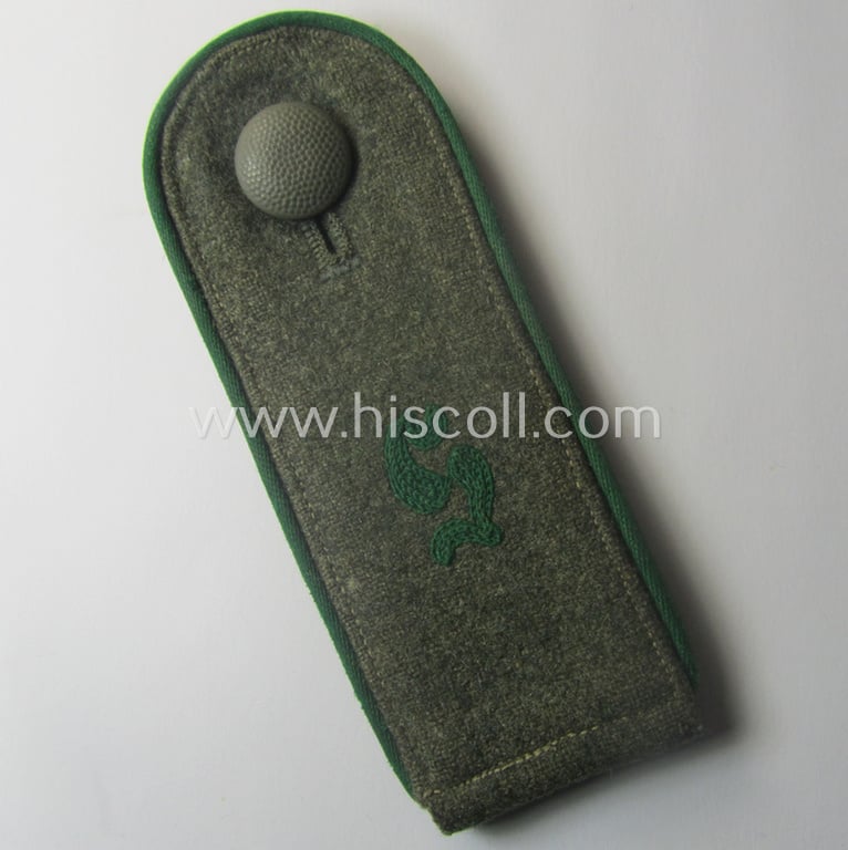 This is a truly very attractive - regrettably single but nevertheless very scarcely encountered and very desirable! - WH (Heeres) early-war-period, 'cyphered' so-called: 'M41- o. M43'-pattern, enlisted-mens'-type shoulderstrap as was piped in the darker-green- (ie. 'grüner'-) coloured branchcolour as was specifically intended for usage by a: 'Soldat u. Mitglied einer Gebirgsjäger-Schule' (or: simple soldier ie. private who served within one of the mountain-trooper-schools) and that comes in an overall very nice- (albeit just moderately used ie. worn-), condition. The neat shoulderstrap - which measures approximately 11,3 cms. in length more often - has the 'standard-type'- and/or field-grey-coloured 'upperdeck' and shows the darker-green-toned- (and desirable 'silk-like'-type!) piping attached (as can be seen on the pictures). Moreover, does it show the neatly machine-embroidered (Gothic-styled, darker-green-toned) capital: 'S'-cypher (or: 'Ziffer') attached (which is excuted in so-called: 'Kurbelstickerei' as can be seen on the pictures). The strap - which comes mounted onto its period tongue and that came with a pebbled-styled uniform-button - shows as stated above some moderate usage and/or wear (some minor staining and/or dust is visible and/or present). This strap originates from an older 'Gebirgjäger'-related shoulderstrap ie. board-collection that I recently acquired for the web-site. Simply a very attractive - and/or: early- (ie mid-) war-period - 'Heeres'-related, EM-type shoulderstrap that was intended for usage by a: 'Soldat u. Mitglied einer Gebirgsjäger-Schule' and that is I deem priced according to its unmistaken rarity and/or desirability!