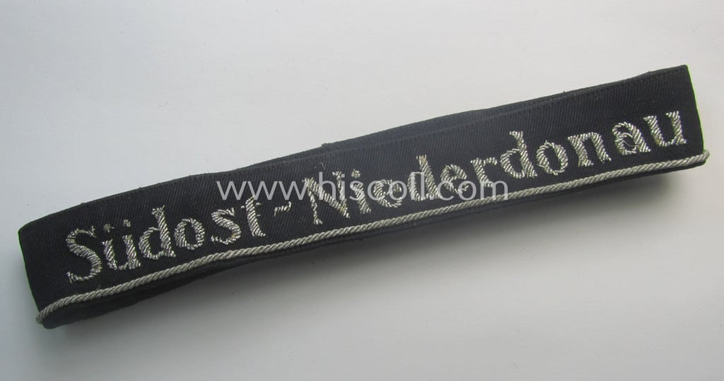 Stunning - and very rarely encountered! - example of a hand-embroidered BDM- (ie. 'Bund deutscher Mädel') officers'-pattern cuff-title (ie. 'Ärmelstreifen für Führerinnen der Bund deutscher Mädel') entitled: 'Südost-Niederdonau'