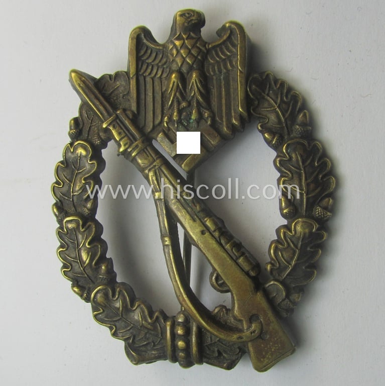 Stunning - and ususually seen! - 'hollow-back'-pattern 'Infanterie Sturmabzeichen in Bronze' being a non-maker-marked example as executed in bronze-toned metal (ie. 'Buntmetall' ie. Tombak) as was produced by the: 'Wilh. Deumer'-company