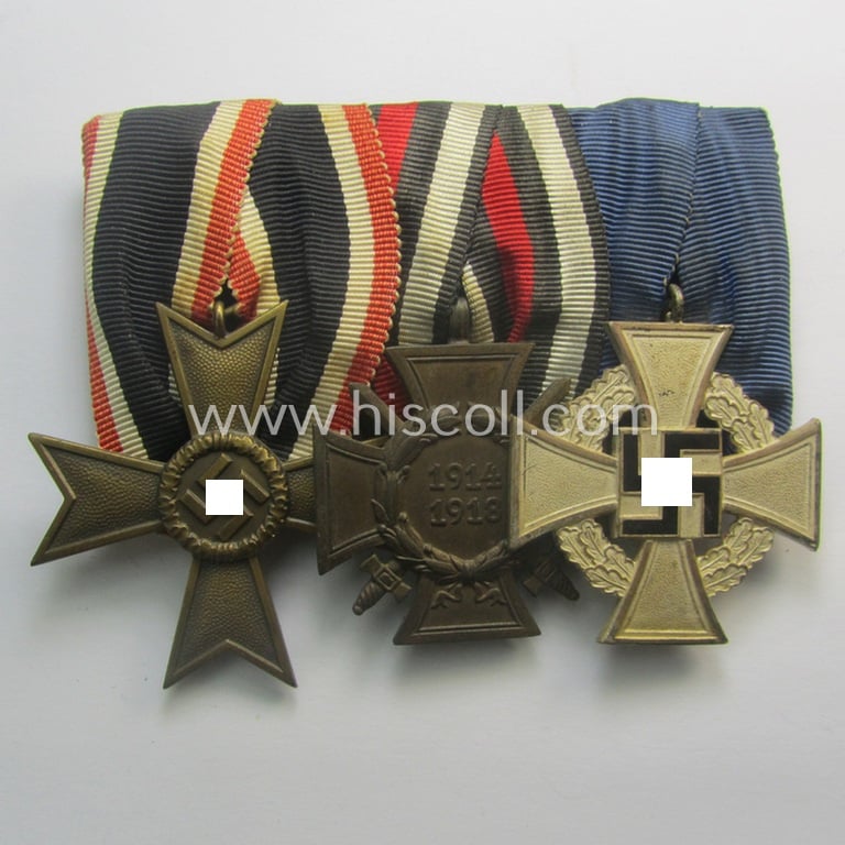 Unusual, 3-pieced 'WWI'- (ie. TR-) related medal-bar (ie. 'Ordenspange') resp. depicting a: 'KvK II. Klasse ohne Schwn.', a: 'FKK 1914-18 mit Schwn.' and a: 'Treuedienst Ehrenzeichen 2. Kl.'