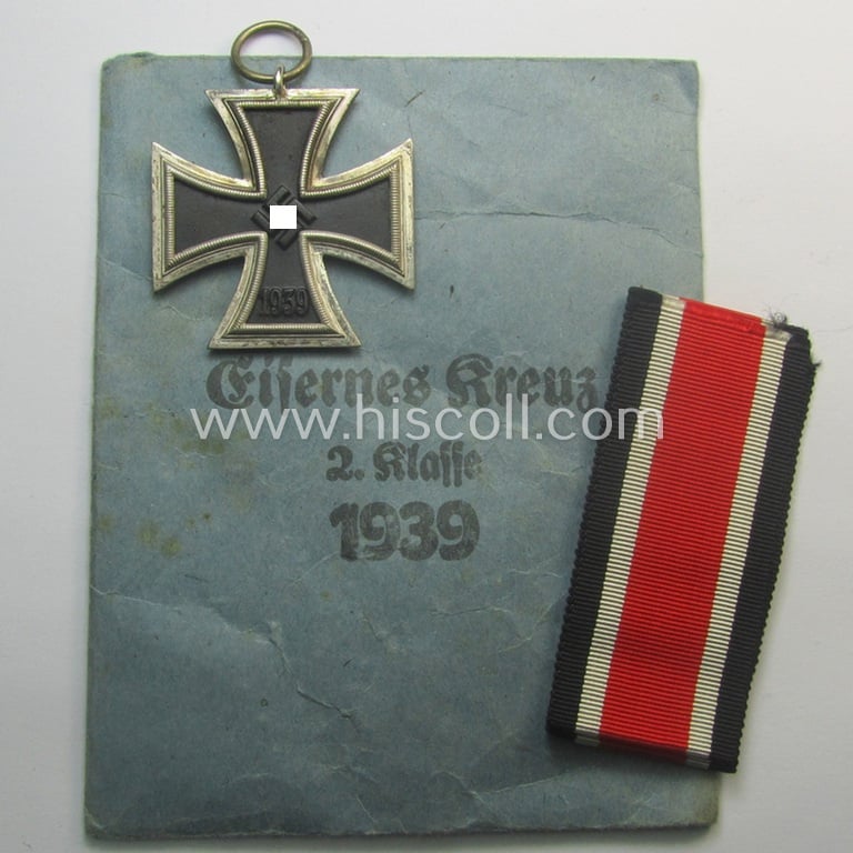 Matching 'EK II. Klasse'-set comprising of a non-maker-marked specimen that comes with its ribbon (ie. 'Bandabschnitt') and 'Zellstoff'-based pouch as was produced by the company: 'L.Chr. Lauer' (ie. 'Hersteller 14')