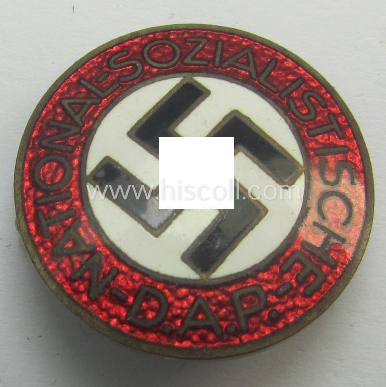 The attractive - truly rarely encountered and nicely preserved! - N.S.D.A.P.-membership-lapel-pin (ie. 'N.S.D.A.P.-Parteiabzeichen') - which has been just moderately used ie. worn - has a very nicely preserved age-patina and has most certainly never been cleaned nor polished: it is showing just minimal wear but is void of any (enamel)damage (as can be seen on the pictures): just some regular wear ie. minimal scratches are noticable. The badge shows the superimposed makers'-designation: 'RzM' and/or: 'M1/159' and is as such an example that was produced by the (rarely seen!) Austrian-based maker named: 'Hans Doppler' as was based in the town of Wels. It shows, moreover, a somewhat tarnished- (ie. minimally stained) finish as can be seen from the pictures. This example - which has a somewhat bright-red-coloured- (ie. enamelled) area - comes mounted onto its regular-styled pin- ie. pin/catch-set-up which is naturally still fully functional and/or present (as can be seen on the pictures). I deem this an attractive 'N.S.D.A.P.'-membership-pin ie. party-badge (by a truly unusually found maker!) that is most certainly priced according to its obvious rarity and/or desirability!
