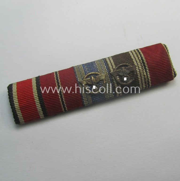 Unusually encountered, 5-pieced, N.S.D.A.P-related ribbon-bar (ie. 'Feld- o. Bandspange') resp. depicting the ribbons for an: 'EKII. Kl.', an: 'Ost'-medal, two: 'N.S.D.A.P.-DA der 2. u. 3. Stf.' and an Austrian 'Anschluss'-medal '13. März 1938'