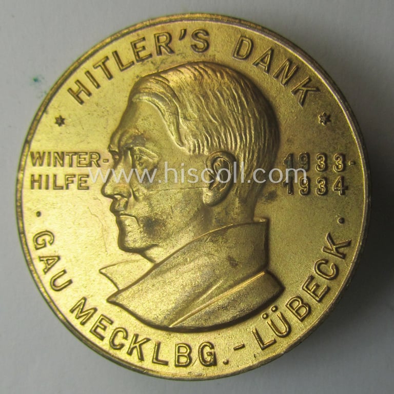 Commemorative - zinc-based- and/or golden-toned - N.S.D.A.P.- (ie. WHW-) related 'tinnie', being a maker- (ie. 'Paulmann u. Crone'-) marked example depicting a portrait of Adolf Hitler surrounded by the text: 'Hitlers' Dank - Gau Meckelbg.-Lübeck'