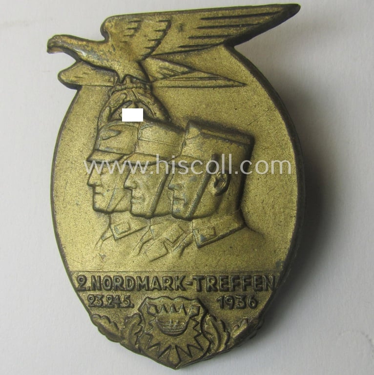 Commemorative, SA- (ie. 'Sturmabteilungen'-) related 'tinnie' depicting an illustration of 3 'SA-Mitglieder' and typical 'Reichsadler'-device coupled with the text: '2. Nordmark-Treffen - 23.24.5.1936'