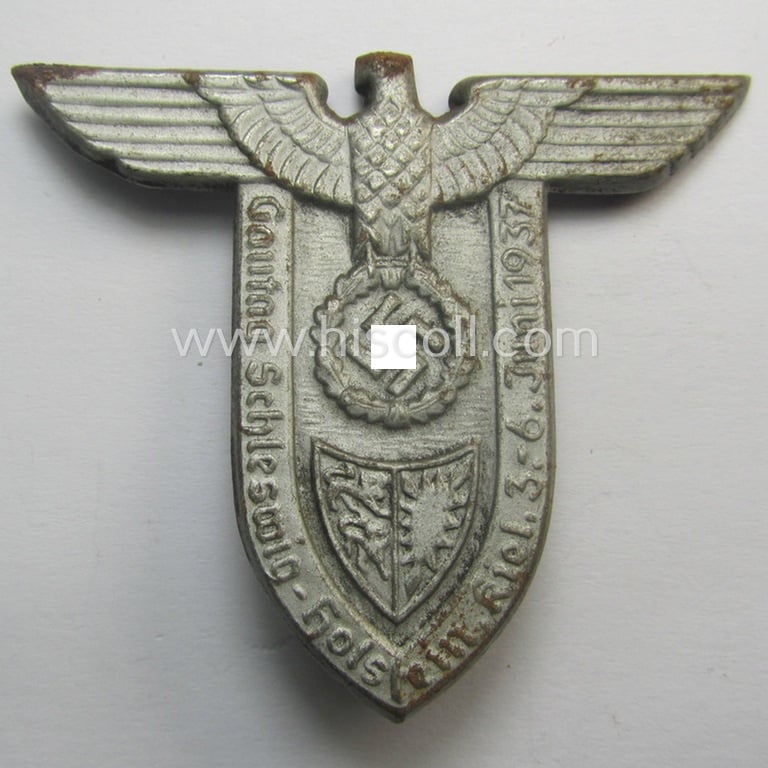 This is an attractive, so-called: N.S.D.A.P.-related day-badge (ie. 'tinnie' or: 'Tagungs- o. Veranstaltungsabzeichen'-) being a (typical) non-maker-marked example, showing a (detailed and pronounced 'Reichseagle'-device) and text that reads: 'Gautag - Schleswig-Holstein - Kiel - 3.-6. Juni 1937' and that comes in an overall nice- (albeit issued- ie. moderately worn-), condition. The attractive and shield-shaped piece is executed in silver-toned- (I deem period-painted) tin-based metal (ie. 'Eisenblech'): it shows some normal wear and/or moderate age but has in my opinion never been cleaned nor polished (it is still a bit dirty but has maintained a nice, somewhat tarnished-, age-patina). The badge comes mounted onto its functional (and unaltered!) pin- ie. pin/catch set-up and shows some minimal age ie. staining (as can be seen on the pictures). Simply a nice occasion to acquire an N.S.D.A.P.-related-, so-called: 'Tagungs- o. Veranstaltungsabzeichen' for an interesting and I deem justified price!