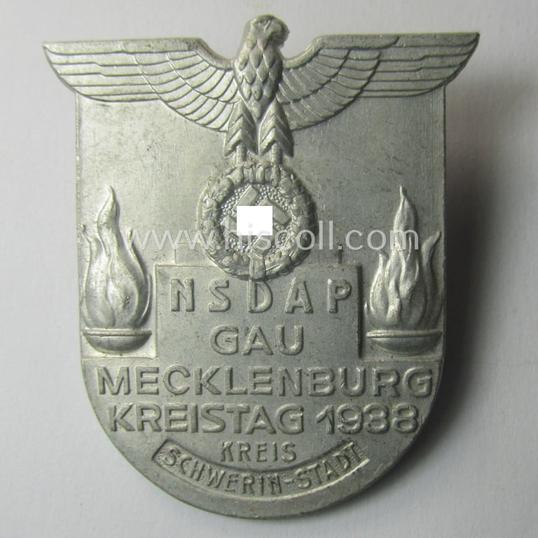 The neat - and with certainty unusually seen! - shield-shaped day badge (ie. 'tinnie' or: 'Veranstaltungsabzeichen') is executed in minimally tarnished, silverish-grey-toned- and/or typical aluminium-based metal and is depicting a detailed illustration of a 'Reichsadler'-device and two fire-baskets coupled with the text: 'NSDAP Gau Mecklenburg - Kreistag 1938 - Kreis Schwerin-Stadt': it does shows some normal wear and/or minimal age. The badge comes naturally mounted onto its functional pin-ie. pin-catch set-up and has (I deem) never been cleaned nor polished: it shows some minimal staining (as can be seen on the pictures) but is still very detailed and/or pronounced. The 'tinnie' shows a clearly present, superimposed makers'-designation that reads: 'L.Chr. Lauer - Nürnberg/Berlin' and retains most (ie. all!) of its (somewhat matted) silver-coloured finish. Simply a neat - and with certainty not that often observed! - regionally-issued, N.S.D.A.P.-related 'tinnie' that is I deem, accordingly priced!