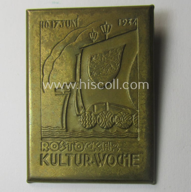 The neat - and with certainty unusually seen! - square-shaped day badge (ie. 'tinnie' or: 'Veranstaltungsabzeichen') is executed in minimally tarnished, golden-bronze-toned- and/or typical tin-based (pot)metal and is depicting a detailed illustration of a: 'Viking-Schiff' (that shows on its sail a large towns'-shield) coupled with the text: 'Rostocker Kulturwoche - 10.-17. Juni 1934': it does shows some normal wear and/or minimal age. The badge comes naturally mounted onto its functional pin-ie. pin-catch set-up and has (I deem) never been cleaned nor polished: it shows some minimal staining (as can be seen on the pictures) but is still very detailed and/or pronounced. The 'tinnie' is totally void of a makers'-designation and retains most (ie. all!) of its (somewhat shiny) golden-coloured finish. Simply a neat - and with certainty not that often observed! - N.S.D.A.P.-related 'tinnie' that is I deem, accordingly priced!