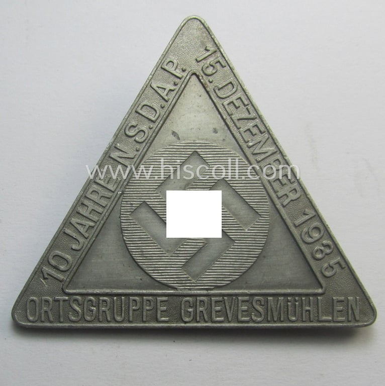 Commemorative, N.S.D.A.P.-related 'tinnie' depicting an illustration of a detailed 'swastika'-device coupled with the text: '10 Jahre N.S.D.A.P. - 15. December 1935 - Ortsgruppe Grevesmühlen'