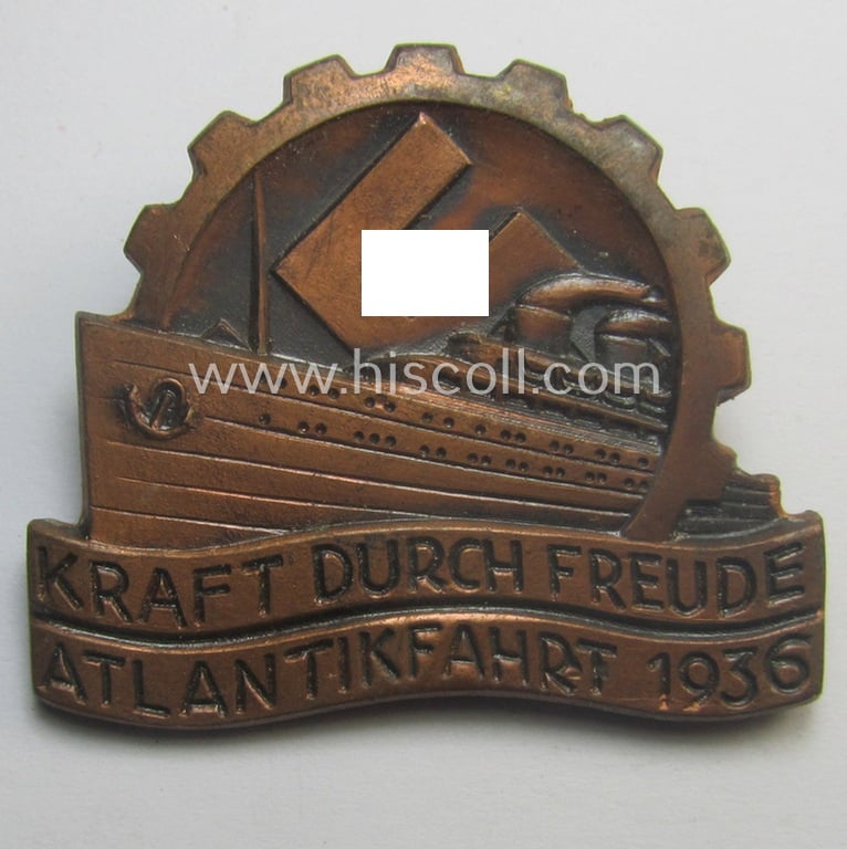 Attractive, so-called: 'KdF'- ('DAF- o. Kraft durch Freude'-) related day-badge (ie. 'tinnie') depicting a large vessel ie. cruise-ship, 'DAF-Zahnrad' and text that reads: 'Kraft durch Freude - Atlantikfahrt 1936'