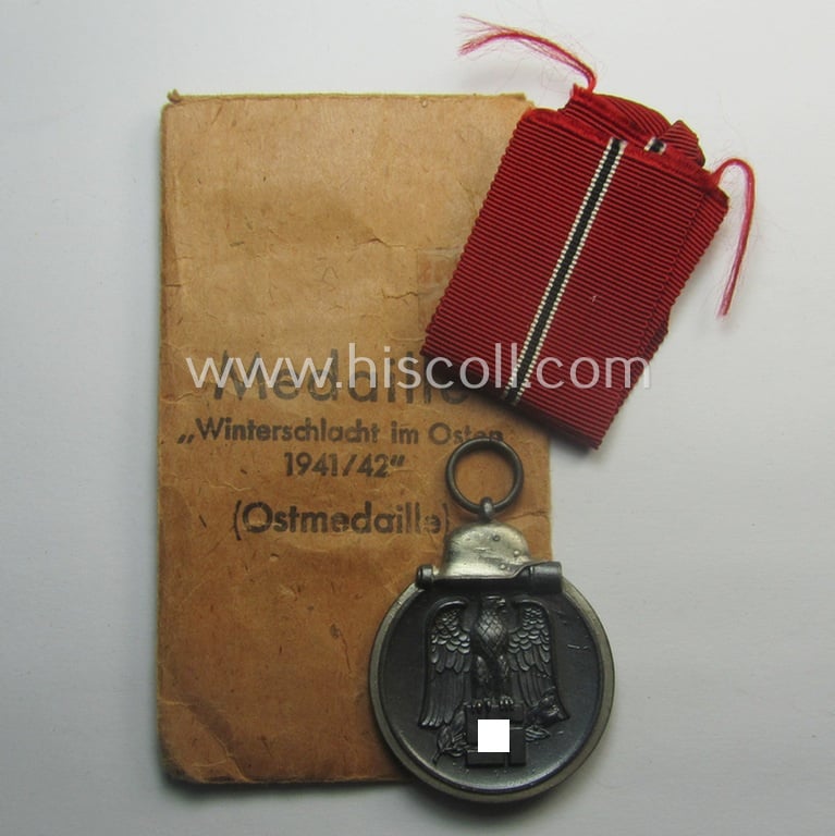 This is an attractive specimen of a: 'Winterschlacht im Osten 1941/42'-medal (ie. 'Ost'-medal) as was produced by the: 'B.H. Mayer'-company and being a non-marked specimen that came stored in its original 'Zellstoff'-based pouch of issue as found and stored for decades. The cross came together with its original, minimally confectioned and folded (approx. 19 cms. long) ribbon and was still packed in its neat ('Zellstoff'-based) and reddish-brown-coloured, carton pouch when found. The medal is - as stated above - a neat silverish-grey-toned- and typical zinc- (ie. 'Feinzink'-) based specimen that was issued but simply hardly used. The medal has a nicely preserved age-patina and was most certainly never cleaned nor polished and therefore are details and/or finish still very nice and/or crisp. The pouch comes in an equally nicely preserved condition: it is fully functional and complete (and shows the printed makers'-mark of the 'B.H. Mayer'-company as was based in the town of Pforzheim on its back as can be noticed on the pictures). Simply a very attractive - and 'matching' and untouched! - 'Winterschlacht im Osten 1941/42'-set that will be hard to be upgraded!