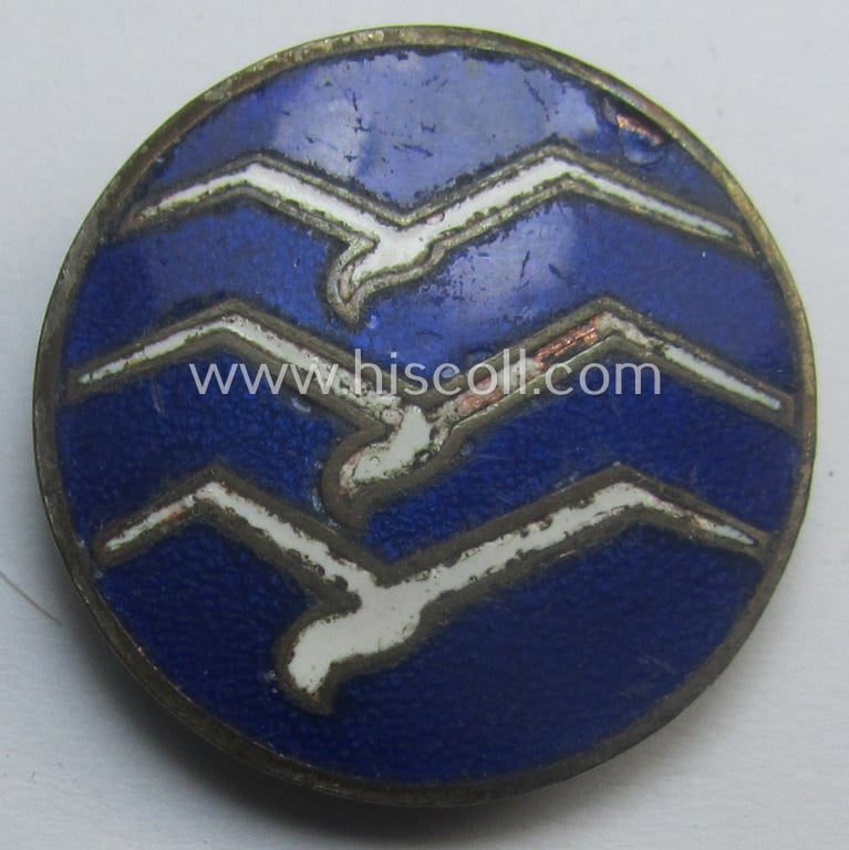This is a neat - and just moderately used and/or worn! - example of a: DLV (ie. 'Deutscher Luftsportsverband') related so-called: 'Segelflieger-C-Abzeichen' being a (typical) non-maker-marked example that retains an almost undamaged enamelled surface and that is void of a serial-number and that comes in an overall nice- (albeit moderately- ie. clearly used and/or worn-), condition. The attractive badge shows three, white-coloured 'Schwingen' and is thus an example of the so-called: 'C-Klasse' (ie. being a: 'Segelflieger-C-Abzeichen' or: glider-pilots badge of the C-class). These attractive badges were worn by members of the DLV but were also worn by 'regular' LW-staff on the standard LW tunics such as the 'Fliegerbluse' and/or other tunics. The badge originates from a German private-household and is just a bit dirty and shows some age and/or wear. The white- and blue-coloured and neatly enamelled piece comes mounted onto its functional 'buttonhole'-set-up and has an approximate diameter of 2,8 cms. and is void of any makers'-designation and has truly nice enamel which shows some minimal damage: it is just a bit tarnished and somewhat darkened by age. A similar example is also figured in the 'Heering-Hüsken'-lapel-pin-catalogue wherein it is given a unique reference-number (8816I) and is given an estimated value of 95 Eu. Simply an attractive 'DLV'-related so-called: 'Segelflieger-C-Abzeichen' that is I deem fairly priced!