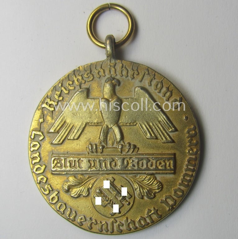 Bright-golden-toned, typical 'Reichsnährstand'- (ie. 'RNSt.'-) related, (portable) loyal-service award entitled: 'Reichsnährstand - Landesbauernschaft Pommern - Für treue Dienste'