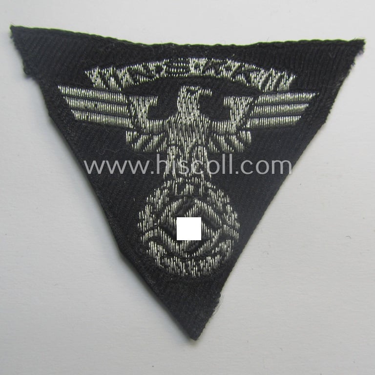 This is an attractive - and truly used- ie. most certainly carefully cap-removed! - example of a so-called: N.S.K.K. (ie. 'National Socialistisches Kraftfahr Korps') side-cap-eagle (ie. 'Adler für Schiffchenmütze') as was specifically intended to be worn onto the black-coloured, so-called: 'N.S.K.K.-Schiffchen o. Lagermütze') being a (regular) 'BeVo-woven' example that comes woven onto a black- (ie. 'schwarzer'-) coloured background and that comes in an overall nice- (ie. just moderately used- ie. worn-), condition. The cap-eagle - which is neatly woven in the so-called: 'BeVo'-type weave-technique - has the black- (ie. 'schwarzer'-) coloured branchcolour and was as such thus intended for the N.S.K.K.-troops that belonged to the: 'N.S.K.K. Motorgruppe Niederrhein' (as can be seen on the pictures). The trapezoid-shaped piece was carefully pre-folded- and confectioned (and was probably once glued-into an album or alike). Simply an attractive example of an 'N.S.K.K.-Adler für Schiffchenmütze' that is I deem accordingly priced!