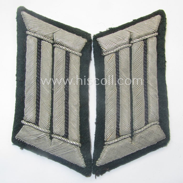 This is an attractive - fully matching and with certainty not that easily found! - pair of 'standard-issue'-pattern', neatly hand-embroidered officers'-type collar-tabs (ie. 'Kragenspiegel für Offiziere') as was piped in the desirable black- (ie. 'schwarzer'-) coloured branchcolour as was specifically intended for usage by an: 'Offizier der Pionier-Truppen' (or: officer who served within an army-engineers unit) and that comes in an overall nice- (ie. clearly used- and/or carefully tunic-removed-), condition. The black-piped pair - which is as more often not 'backed' - is neatly hand-embroidered in silverish-coloured 'braid' and comes as carefully tunic-removed as found (as can be seen on the pictures). The pair shows some moderate age, wear and/or staining (as can be seen on the pictures). The pair originates from a private-household in Germany. Simply an attractive collar-tab-pair that was intended for an: 'Offizier der Pionier-Truppen' and that is accordingly priced!