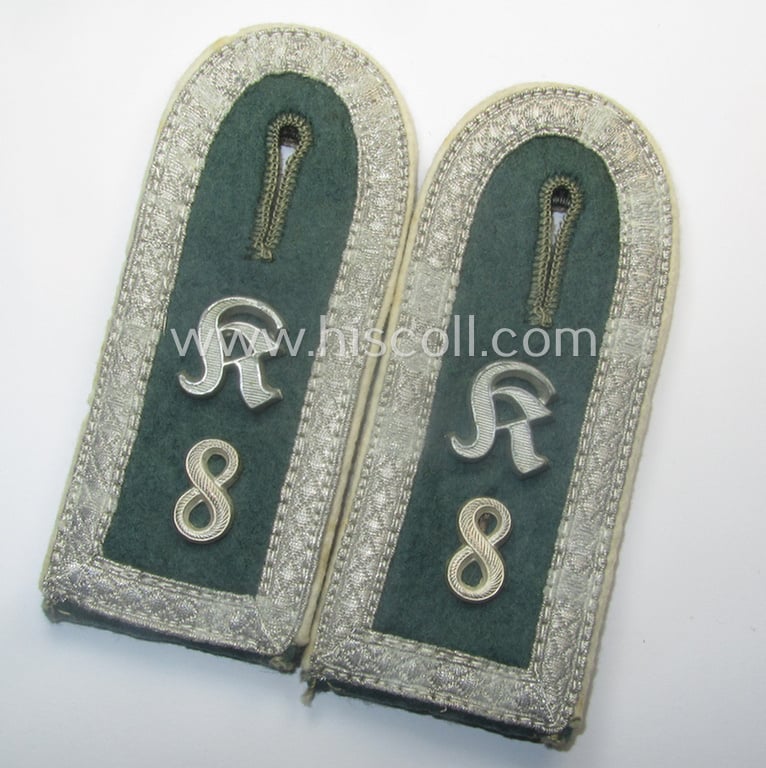 This is an attractive - fully matching and actually scarcely encountered! - pair of (typical) 'privately-purchased'- (ie. tailor-made) pattern, WH (Heeres), early- (ie. mid-) war-period- (ie. 'M41'-pattern) NCO-type shoulderstraps as piped in the desirable, white- (ie. 'weisser'-) coloured branchcolour as was intended for - and I deem moderately used by! - an: 'Unterfeldwebel des Kradschützen-Bataillons 8' (or: NCO and junior-sergeant who served within the army-infantry-related, motor-cycle bataillion, numbered: '8') and that comes in an overall very nice- (albeit just moderately used ie. worn-), condition. The straps - which I deem are of the early-war-period ie. so-called: 'M41'-pattern - have the field-grey-coloured 'upperdecks' and have the neat, white- (ie. 'weisser'-) coloured and/or woolen-type piping attached (as can be seen on the pictures). The tongues are naturally also present. The straps - which are totally constructed from so-called: 'boiled-wool' - are regular-sized- and measure 11,2 cms. in length each. The straps show the neat, siverish-coloured- and/or 'standard-issue'-pattern- (ie. 'Heeres-type') NCO-braid attached and have a pair of bright-silver-toned (Gothic-styled, larger-sized and/or 'Buntmetall'-based) so-called: 'K'-cyphers (ie. 'Ziffern') and a pair of (larger-sized, older-styled and equally-styled) '8'-numerals period-attached denoting the NCO's rank of an: 'Unterfeldwebel'. This scarcely seen pair originated from an older and extensive shoulderstrap-collection I recently acquired for the web-site. The pair on offer here just shows some truly moderate age, wear and or staining and does show some truly minimal moth-damage on their backs (as can be seen on the pictures). Simply an attractive - and typically 'privately-purchased'! - 'Kradschützen'-related NCO shoulderstrap-pair that will be very hard to be upgraded and that is (I deem) accordingly priced!
