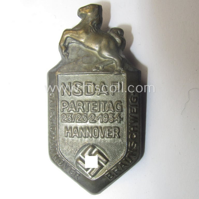 This is an attractive - and neatly 'hollow'-styled! - so-called: N.S.D.A.P.-related 'tinnie' (ie. 'Tagungs- o. Veranstaltungsabzeichen') being a typical maker- (ie. 'Fr. Linden'-) marked- and/or somewhat bright bronze toned- (ie. I deem copper-toned and/or 'Eisenblech'-based) example showing the text: 'N.S.D.A.P.-Parteitag - 23/25-2-1934 - Hannover' (and sub-titled: 'Gau Süd-Hannover - Braunschweig') and that comes in an overall very nice- (albeit issued- ie. just moderately worn-), condition. The piece is executed in typical, golden-bronze-coloured metal: it shows some normal wear and/or moderate age but has never been cleaned nor polished (it is still a bit dirty but has maintained a nice, minimally darkened- ie. tarnished-, age-patina and holds most of its period-apllied finish). The badge - which shows the makers'-designation 'Fr. Linden' on its back as more often - comes naturally mounted onto its functional pin- ie. pin/catch set-up and shows some minimal age ie. staining (as can be seen on the pictures). The piece shows a galopping horse and/or swastika-sign with below the text: 'N.S.D.A.P.-Parteitag - 23/25-2-1934 - Hannover'. Simply a nice occasion to acquire an attractive - and fairly early-period! - N.S.D.A.P.-related, so-called: 'Tagungs- o. Veranstaltungsabzeichen' for an interesting price!