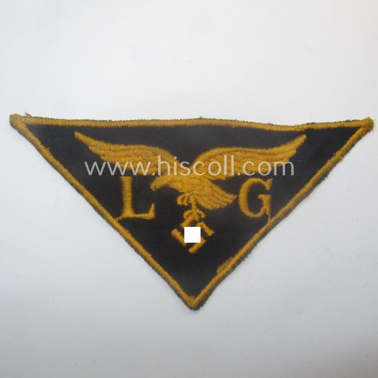 This is a neat - I deem just moderately used and surely unusually seen! - example of a WH (Luftwaffe) related (and I deem EM- ie. NCO-pattern), machine-embroidered breast-badge ie. eagle-device) showing the machine-embroidered 'L'- and 'G'-characters (as was presumably intended for staff working within the WH (Luftwaffe-related) so-called: 'Generalluftzeugmeister'- (ie. 'GL'-) organisation and that comes in an overall nice- (ie. I deem just moderately used- and/or carefully tunic-removed-), condition. This fairly unknown, TR-period-organisation - which was staffed with merely civilian personal but had commissioned (ie. air-force-) staff in the lead - was presumably active in various industrial- ie. building tasks dealing with the greater Luftwaffe. There is not much reference-work for the exact tasking ie. usage of these breast-badges. The badge on offer here is a detailed example that is executed in golden-yellow-coloured, linnen-based thread as woven onto a black-coloured (and also linnen-based) background. The badge - which is regular-sized and that measures from corner to corner approx 11,2 cms. - shows some truly minimal aging and/or wear. Simply an attractive - and most certainly unusually encountered! - WH (LW) 'Generalluftzeugmeister'-related breast-badge that is priced according to its comparative scarcity and/or desirability!