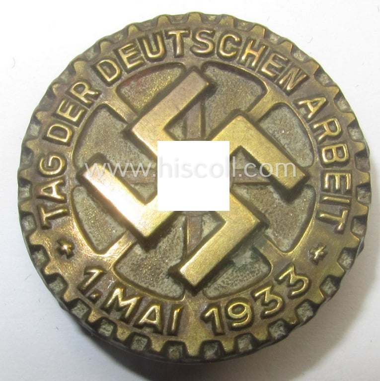 Neat, early-period DAF- (ie. 'Deutscher Arbeits Front'-) related day-badge (ie. 'tinnie' or: 'Veranstaltungsabzeichen') as was issued to commemorate the: 'Tag der deutschen Arbeit - 1. Mai 1933'