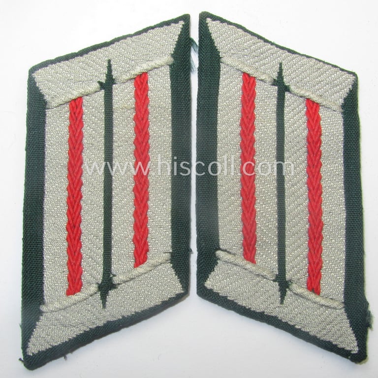 This is a very attractive - scarcely encountered and I deem just minimally used- ie. worn! - pair of WH (Heeres) (later-war-pattern) officers'-type collar-tabs (ie. 'Kragenspiegel für Offiziere des Heeres') as was entirely executed in the neat 'BeVo'-weave pattern and that is piped in the bright-red- (ie. 'hochroter'-) coloured branchcolour as was intended for an officer who serving within the: '(Sturm)Artillerie-Truppen'- (ie. officer who served within an artillery regiment ie. unit) and that comes in an overall very nice- (ie. I deem hardly used- ie. carefully tunic-removed-), condition. The neat pair - which is 'backed' with beige-coloured- and/or 'buckram'-based material as is more often observed - is just a tiny bit stained due to minimal wear and decades of storage and/or handling and comes as recently found. These tabs were the typical 'later-war'-version of the 'standard'- and regular-embroidered officers'-type collar-tabs. Both tabs are void of a blue-inked 'D.R.G.M.'-stamp on their backs (as is more often but not always encountered as can be noticed on the pictures). Simply a great pair of '(Sturm)Artillerie-Truppen'-related, officers'-pattern 'Kragenspiegel' that comes in a truly wonderful condition: hard to find a nicer and more attractive pair in this desirable branchcolour for a more interesting price!