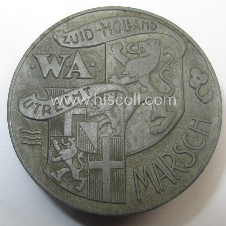 Attractive, Dutch NSB-party- (ie. WA-) related lapel-pin (ie. 'Veranstaltungsabzeichen' ie. tinnie) that is executed in zinc-based metal and that is depicting the text: 'WA-Marsch - Zuid-Holland - Utrecht' (1942)