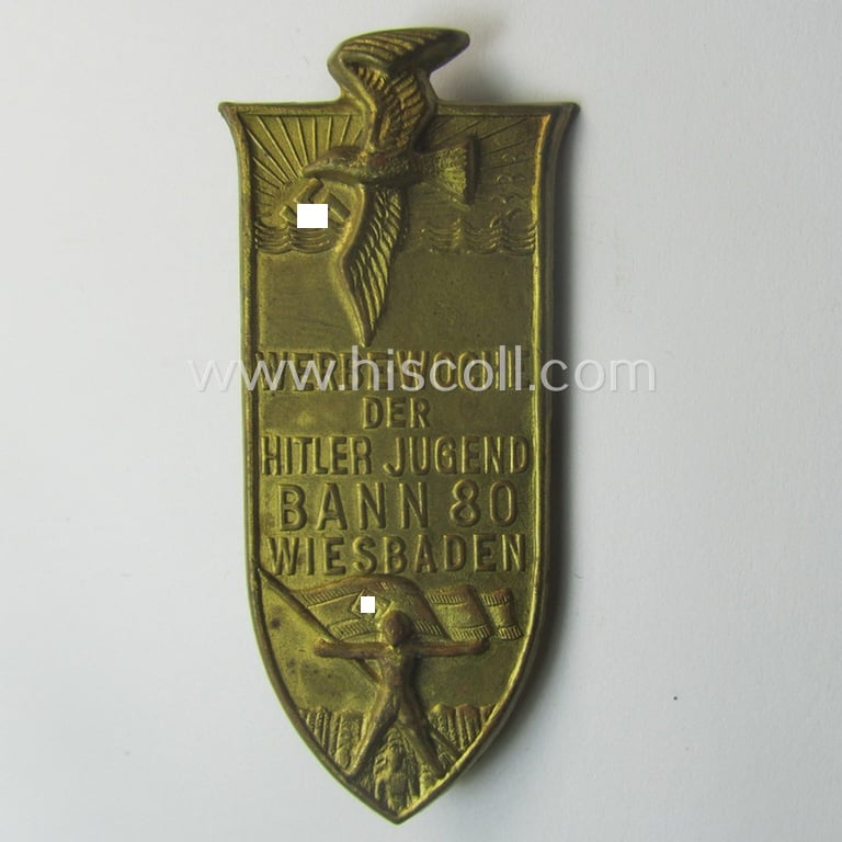The attractive - bright-golden-toned- (albeit minimally tarnished) and elongated ie/ shield-shaped - HJ-day-badge (ie. 'tinnie' or: 'Veranstaltungsabzeichen') is executed in typical zinc- (ie. tin-) based metal: it shows some normal wear and/or moderate age but has I deem never been cleaned nor polished (it is still a bit dirty but has maintained a nice - and as stated above - somewhat tarnished age-patina). The badge comes mounted onto its functional pin- ie. pin/catch-set-up and shows some minimal age ie. staining (as can be seen on the pictures). The 'tinnie' is very detailed and retains most of of its golden-coloured finish (as can be seen on the pictures). The piece shows an illustration of a (swastika) sunburst, sea-gull and HJ-flag-bearer coupled with the text: 'Werbewoche der Hitler Jugend - Bann 80 - Wiesbaden' (and is strangely void of any date- or year-designation). Simply an attractive example of this desirable and/or with certainty sought-after HJ-related so-called: 'HJ-Veranstaltungsabzeichen'!