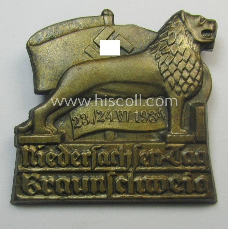 Early-period, 'N.S.D.A.P.'-related day-badge (ie. 'tinnie' or: 'Veranstaltungsabzeichen') being a non-maker-marked example depicting a lion and swastika-flag coupled with the text: 'Niedersachsen-Tag - Braunschweig - 23./24.VI.1934'