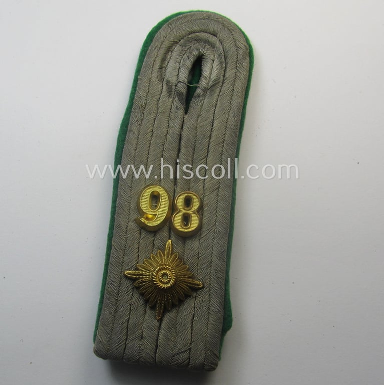 Attractive - albeit regrettably single! - WH (Heeres) 'cyphered' officers'-type shoulderboard as piped in the darker-green- (ie. 'grüner'-) coloured branchcolour as was intended for an: 'Oberleutnant des Gebirgsjäger-Rgts. 98'