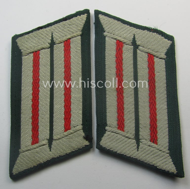 This is neat - and actually scarcely encountered and I deem just minimally used- ie. worn! - pair of WH (Heeres) (later-war-pattern) officers'-type collar-tabs (ie. 'Kragenspiegel für Offiziere des Heeres') as was entirely executed in the neat 'BeVo'-weave pattern and that is piped in the bright-red- (ie. 'hochroter'-) coloured branchcolour as was intended for an officer who serving within the: '(Sturm)Artillerie-Truppen'- (ie. officer who served within an artillery regiment ie. unit) and that comes in an overall nice- (ie. I deem just moderately used- ie. carefully tunic-removed-), condition. The neat pair - which is 'backed' with beige-coloured- and/or 'buckram'-based material (one tab shows a carton-based backing) as is more often observed - is just a tiny bit stained due to minimal wear and decades of storage and/or handling and comes as recently found. These tabs were the typical 'later-war'-version of the 'standard'- and regular-embroidered officers'-type collar-tabs. Both tabs are void of a blue-inked 'D.R.G.M.'-stamp on their backs (as is more often but not always encountered as can be noticed on the pictures). Simply a great pair of '(Sturm)Artillerie-Truppen'-related, officers'-pattern 'Kragenspiegel' that comes in an overall nice condition: hard to find a nicer and more attractive pair in this desirable branchcolour for a more interesting price!