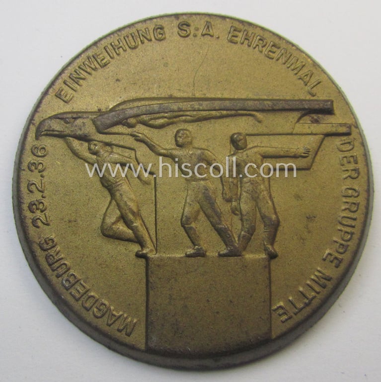 Commemorative, SA- (ie. 'Sturmabteilungen'-) related 'tinnie' being a non-maker-marked example showing three sportsmen and eagle-statue coupled with the text: 'Einweihung S.A.-Ehrenmal der Gruppe Mitte - Magdeburg - 23.2.1936'