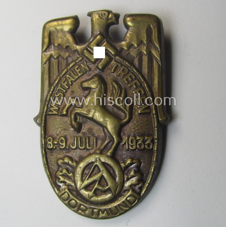 Commemorative, golden-bronze-coloured N.S.D.A.P.- (ie. 'SA- o. Sturmabteilungen'-) related 'tinnie' being a non-maker-marked example showing a detailed eagle-device, SA-logo- and text: 'Westfalentreffen - Dortmund - 8.9. Juli 1933'